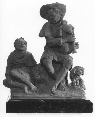vlg. Mr. J. van der Marck (Leiden), Amsterdam 28-5-1773 nr. 21: een fraaije groep van twee zittende mannetje, waarvan één is spelend op een doedelzak, met een hond (verg.ned. Mus. Nr. 29; door Pieter Savery); vlg. Amsterdam (Fred Muller) 6-5-1913 nr.1223 m afb. Charmante groupe de deux figures a Terre cuite par P. Xavery - une défectuosité, gesigneerd en gedateerd: P Xaveri 1673 Anwerpienis, zonder voetstuk; vlg. waarschijnlijk gedeelte, Maison Mensing et Fils Amsterdam (Fred Muller) 17-11-1936 nr. 504, dezelfde tekst als bij 2, heeft behoord tot de collectie van B.C.S. Criel; aankoop op die veiling.
