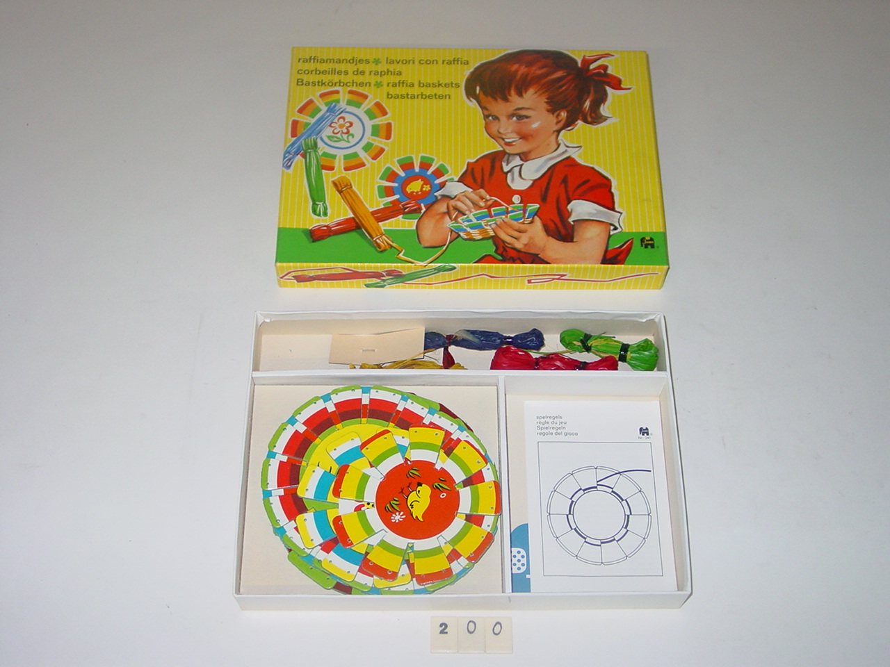 Kartonnen mandjesbasis wordt in raffia gewikkeld. Inhoud van rechthoekige doos met deksel: zes bases voor mandjes in verschillende grootten, raffia in vier kleuren en naald.- Trefwoorden