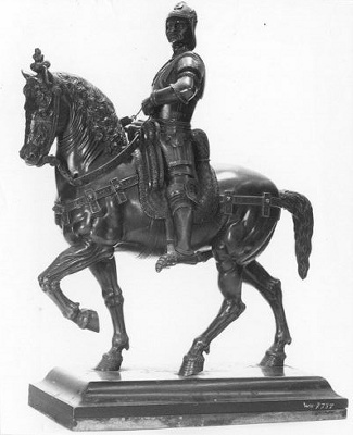 Kopie naar het bronzen ruiterstandbeeld voor de veldheer Bartolomeo Colleoni uit 1479-1495 door Andrea del Verrocchio (1436-1488) op het Campo di SS. Giovanni e Paolo te Venetië. Naar het beeld werden in de 19de eeuw kleine bronzen kopieën gemaakt.