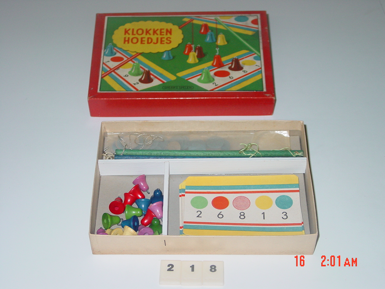 4 kaarten met standplaatsen; klokken in 5 kleuren; 3 hengels; fiches als