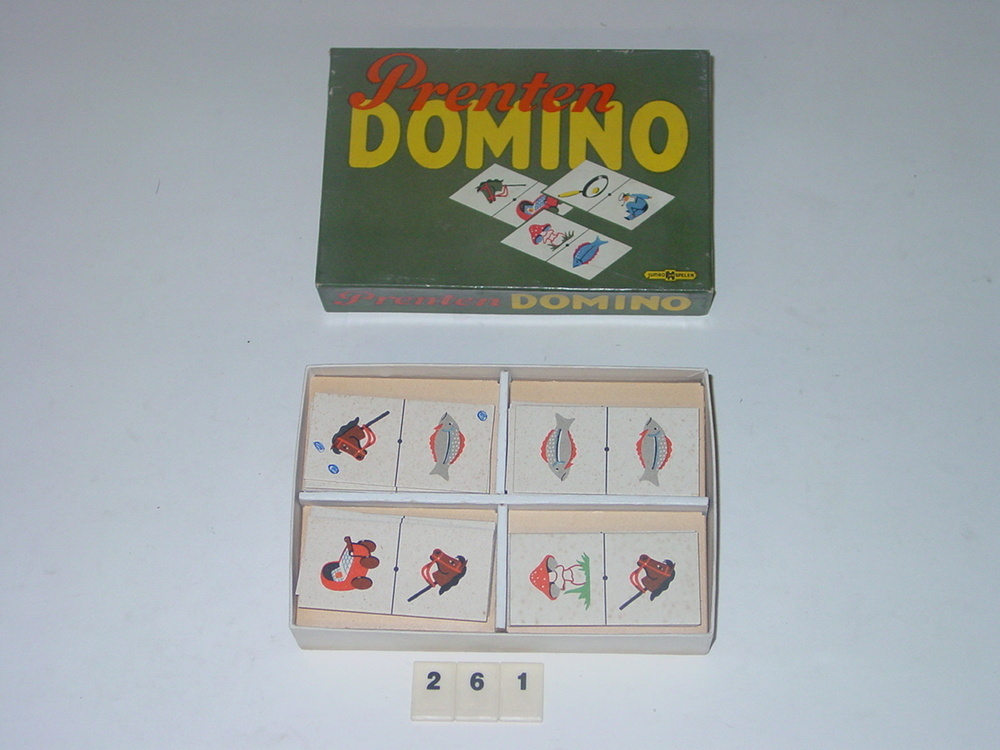 Dominospel met afbeeldingen. Rechthoekige doos met deksel, inhoud: 28 dominokaartjes met afbeeldingen.- Trefwoorden