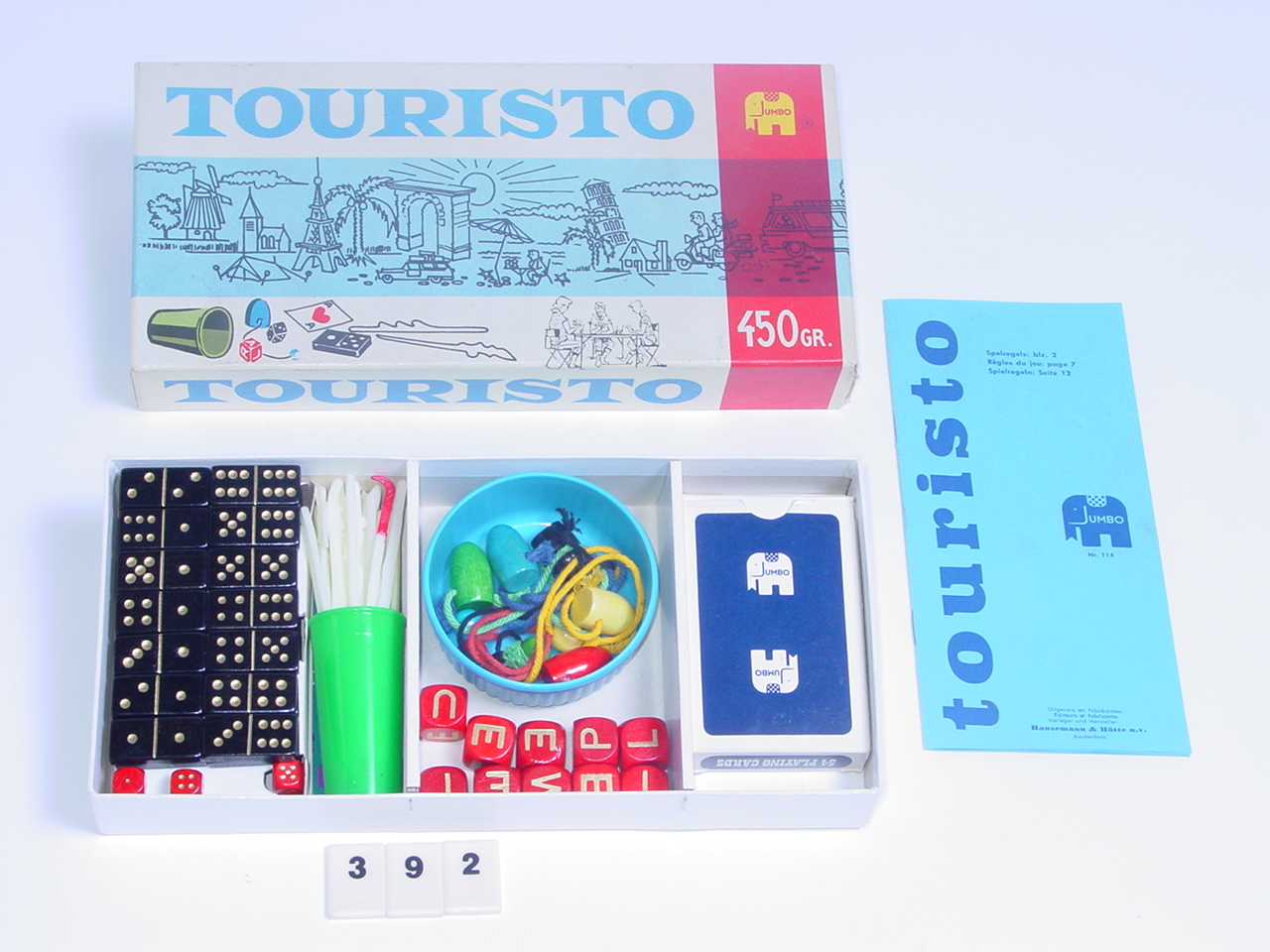 Klein spellenmagazijn, om mee te nemen op reis of op vakantie. Rechthoekige doos met deksel, inhoud: handleiding (Nederlands, Frans, Duits); houten geef- en neemtol; spel kaarten in etui; elf houten letterdobbelstenen; plastic bakje met houten bommen aan touwtje voor het spelletje Quick; kunststof dobbelbekertje; vijf kleine houten dobbelstenen (1 cm); kunststof Mikado stokjes; kleine houten domino stenen.
