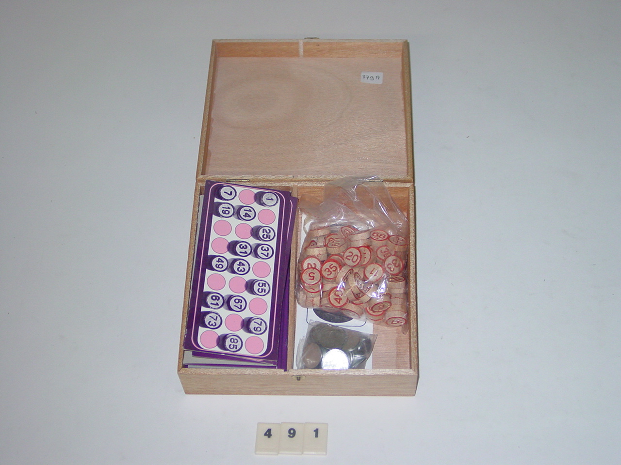 houten kistje; lottokaarten; houten lottocijfers; doosje met blikken