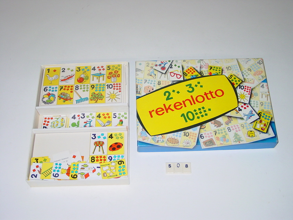 Lottospel waarmee men kan leren tellen. Inhoud van rechthoekige doos met deksel: grote kaarten en kleine kaarten.- Trefwoorden