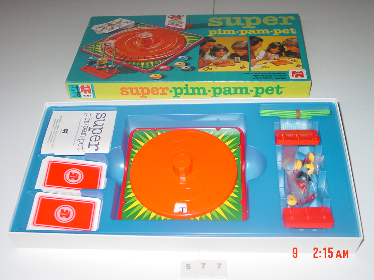 Uitgebreide versie van Pim Pam Pet. In doos: vier standaards; bundel stokjes; draaischijf; vragenkaartjes; fiches; handleiding.- Trefwoorden
