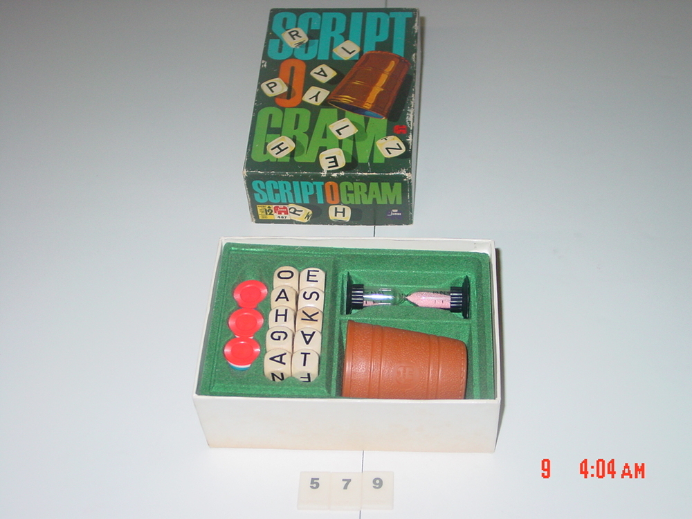 Spel waarbij woorden moeten worden gevormd met behulp van letterdobbelstenen. Inhoud van rechthoekige doos met deksel: tien letterdobbelstenen, dobbelbeker, garantiebewijs, zandloper, drie rode fiches, twee witte fiches en drie blauwe fiches.- Trefwoorden