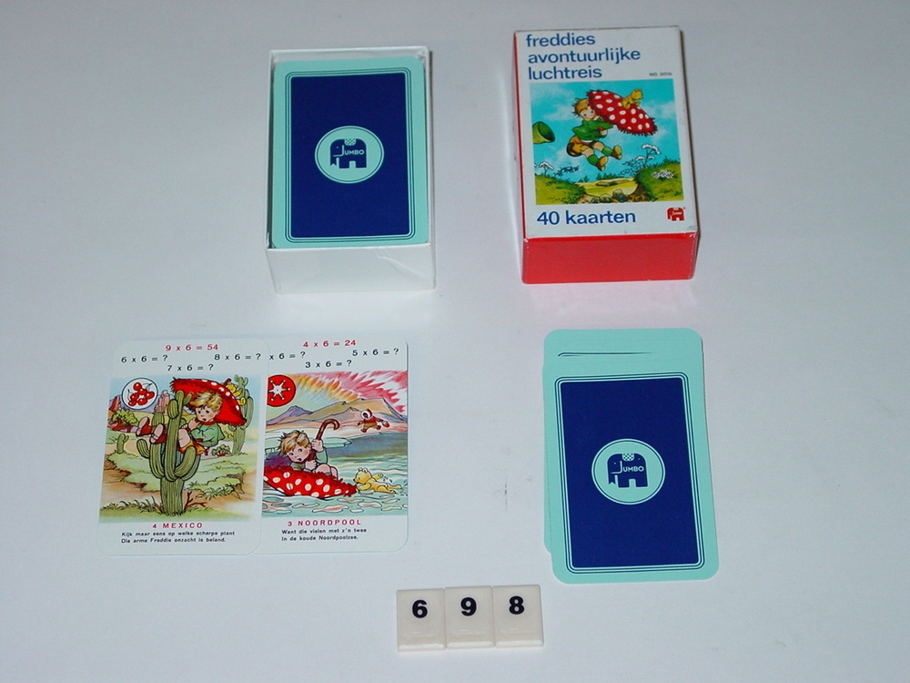 Kwartetspel. Op elke kaart staat een plaatje en een sommetje. Aan de onderkant