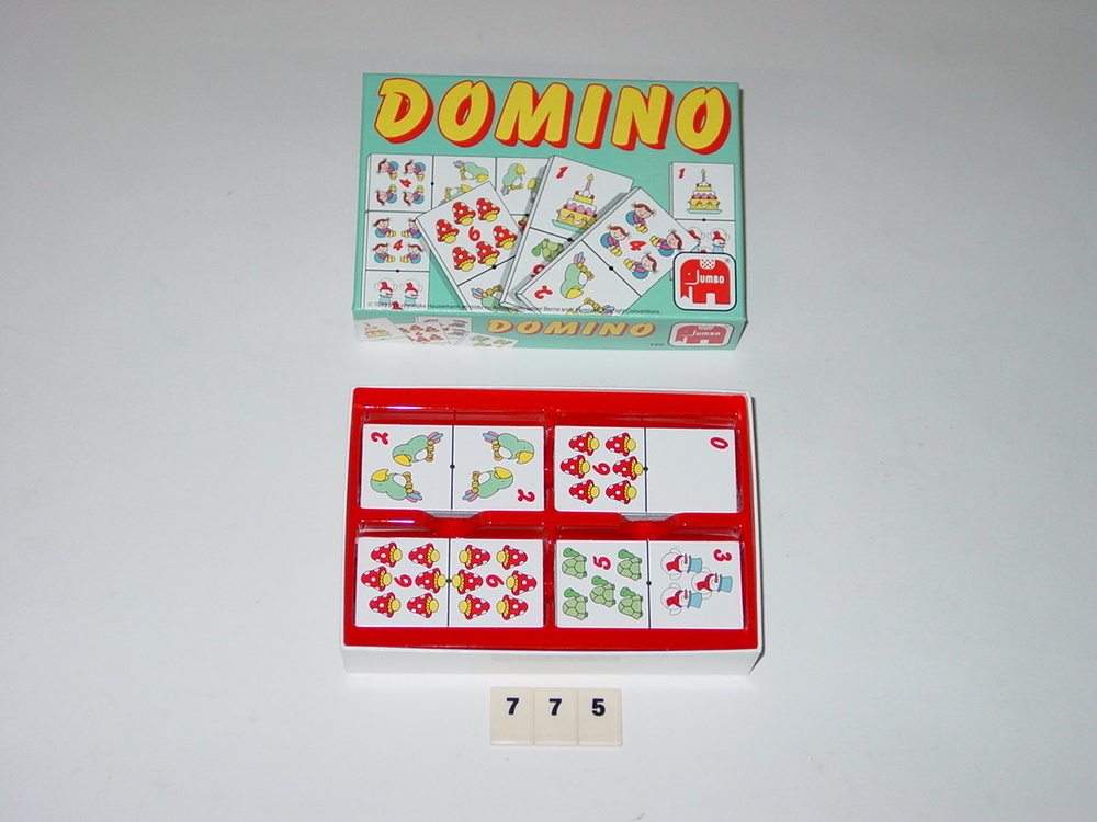 28 kaarten met op iedere kaart 2 plaatjes en cijfers, spelregels,