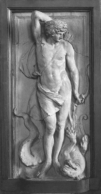 model voor het marmeren reliëf van Apollo in de zuidwesthoek van de zuidelijke galerij van het 17de-eeuwse stadhuis. Het paneel maakt deel uit van een reeks van acht planeten en goden, aangebracht tussen de deuren naar een aantal kantoorvertrekken en tussen de doorgangen naar de trappenhuizen. Apollo, god van de zon en schepper van de harmonie, staat tussen de deuren, voorheen toegang gevend tot de vertrekken van de Commissarissen van Kleine Zaken. De flankerende lunetten (waarvan beide modellen in fragmenten bewaard bleven) zijn met de iconografie van het reliëf - deels te herleiden op Ripa - in overeenstemming. In de bewaard gebleven Quellinus-rekeningen uit 1651 worden de geboetseerde godenreliëfs met Diana en Apollo als 'bassereleef 3 voet hooge' voor 60 gulden per stuk vermeld. De marmeren uitvoering van Apollo werd kort na oktober 1651 verwezenlijkt. In de Notitie uit 1769 van Ploos van Amstel wordt 'de Apollo' genoemd. Het model is mogelijk een repliek. Van het model met Apollo bevindt zich een - vrijwel identiek - exemplaar in een particuliere verzameling in Antwerpen.