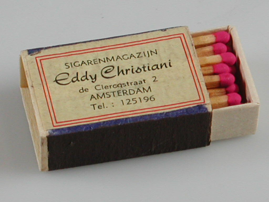 - tekst bovenzijde: SIGARENMAGAZIJN/ Eddy Christiani/ de Clercqstraat 2/ AMSTERDAM/ Tel. : 125196