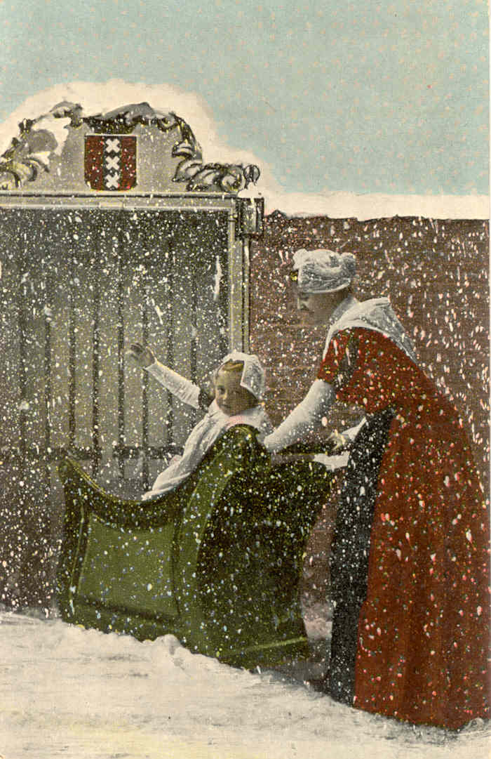 In het Amsterdamse Burgerweeshuis konden kinderen van Amsterdamse poorters (burgers met rechten om in de stad te wonen) terecht, die geen ouders of een moeilijke thuissituatie hadden. Het weeshuis was eeuwenlang een gesloten instelling, waar buitenstaanders niet zomaar naar binnen mochten. Voor de creatie van een fotoalbum, ter ere van het 25-jarige huwelijk van bouwkundige Pieter Heyn in 1904, werd een uitzondering gemaakt. Fotograaf August Stap maakte een unieke serie foto’s van het interieur, de wezen en het personeel van het Burgerweeshuis. Op de foto’s zijn de Burgerwezen tijdens hun dagelijkse bezigheden te zien. Zo komen onder meer de naailes voor meisjes, het ‘Slöjd’-onderwijs voor jongens en de zondagse gang op weg naar de kerk voorbij. Een groot aantal van de foto’s zijn later gebruikt voor de productie van een serie ansichtkaarten in kleur, waaronder deze ansichtkaart van burgerweesmeisjes in de sneeuw. ( Sarah Remmerts de Vries)