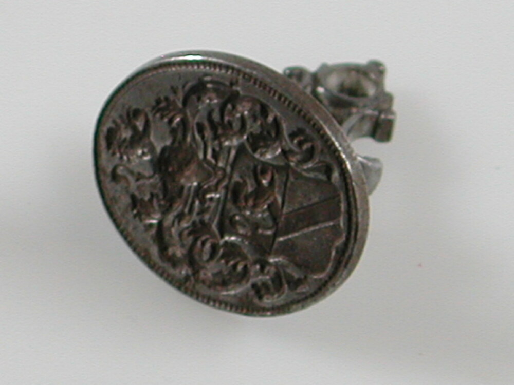 Ovaal cachet waarop wapenschild met helm. Metalen handvat.- HerkomstAfkomstig uit nalatenschap van Petronella Marie Suzanne Backer van Leuven (1878-1961)