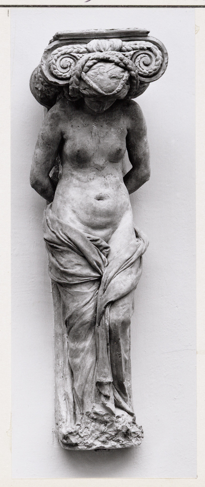 schets voor een van de vier marmeren kariatiden in de Vierschaar van het 17de-eeuwse stadhuis, de tweede figuur van links. In 1650 ontving Quellinus 240 gulden voor de vervaardiging van vier geboetseerde 'bedructe en gevange vroubelten'. De marmeren kariatiden werden twee jaar later voor 800 gulden per beeld gehakt. In dezelfde rekening wordt een bedrukte vrouwentronie met een kapiteel op het hoofd vermeld voor 15 gulden. In zijn Notitie uit 1769 vermeldt Ploos van Amstel de aanwezigheid in de Kunstkamer van 'de vier Cariatiden van de vierschaar', alsmede van een 'hooft met een borst van een van de Cariatiden uit de vierschaar'. Van deze losse kop rest thans geen spoor. Kariatiden zijn bekend uit de bouwkunst van de klassieke oudheid. De bedrukte en gevangen vrouwen van Quellinus herinneren aan soortgelijke figuren van onder andere Cornelis Floris (1514-1575) en zijn school.