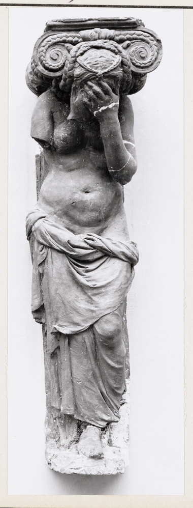 schets voor een van de vier marmeren kariatiden in de Vierschaar van het 17de-eeuwse stadhuis, de vierde figuur van links. In 1650 ontving Quellinus 240 gulden voor de vervaardiging van vier geboetseerde 'bedructe en gevange vroubelten'. De marmeren kariatiden werden twee jaar later voor 800 gulden per beeld gehakt. In dezelfde rekening wordt een bedrukte vrouwentronie met een kapiteel op het hoofd vermeld voor 15 gulden. In zijn Notitie uit 1769 vermeldt Ploos van Amstel de aanwezigheid in de Kunstkamer van 'de vier Cariatiden van de vierschaar', alsmede van een 'hooft met een borst van een van de Cariatiden uit de vierschaar'. Van deze losse kop rest thans geen spoor. Kariatiden zijn bekend uit de bouwkunst van de klassieke oudheid. De bedrukte en gevangen vrouwen van Quellinus herinneren aan soortgelijke figuren van onder andere Cornelis Floris (1514-1575) en zijn school.