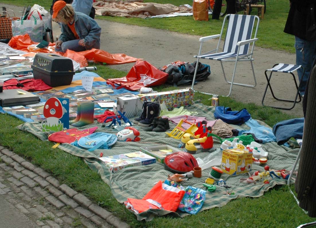 Rond 1970 werd het in Amsterdam gebruikelijk om bij de viering van de verjaardag van de koningin vrijmarkten te organiseren. Kinderen verdienden wat bij door muziek te maken. Ook verkochten ze zelfgemaakte spullen of gebruikt speelgoed en kleding, zoals de zesjarige Eva Schoonings in 2004. Op 30 april 2004 kocht het Amsterdam Museum dit kleedje met handelswaar op de vrijmarkt in het Vondelpark. Met deze aankoop wilde het museum een typisch Amsterdams fenomeen vastleggen ( Judith van Gent)