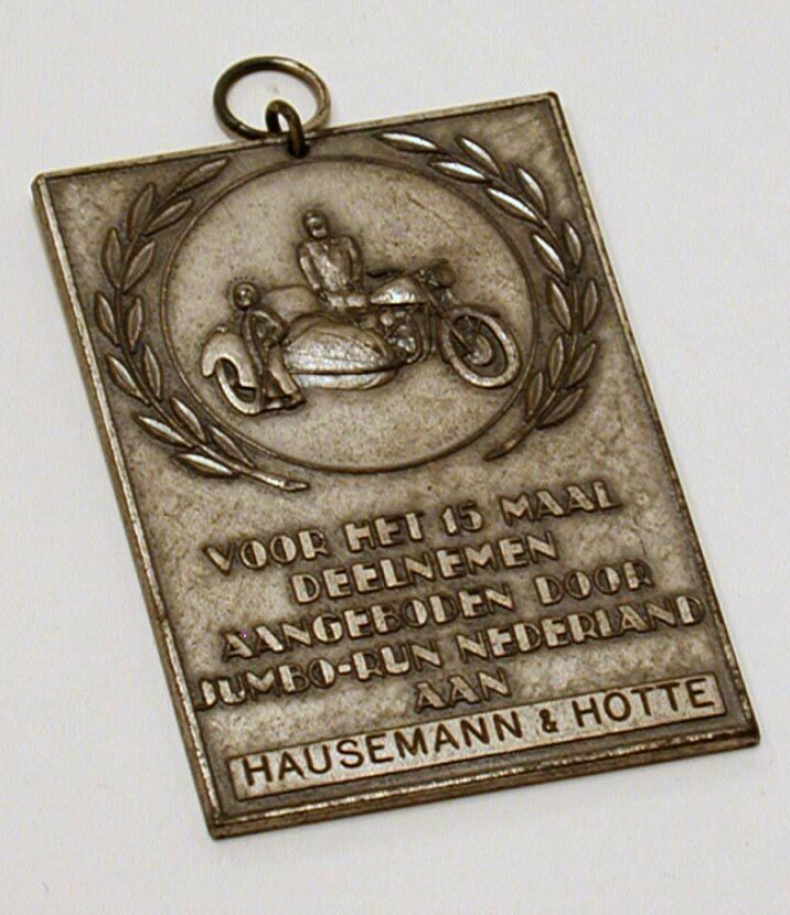 voorzijde: een rechthoekige staande penning waarop een motorfiets met zijspan en twee berijders in een ovaal met lauwerkrans. Daaronder een opschrift. Bovenaan een oog met ring.