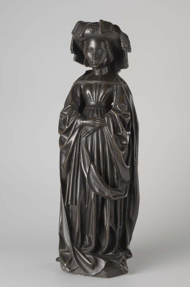 Een grafbeeldje uit een reeks van tien (oorspronkelijk 24), afkomstig van het praalgraf van Isabella van Bourbon (gestorven 1465), in 1476 opgericht in de Sint-Michaelsabdij te Antwerpen. Dergelijke graffiguren - in werkelijkheid verwanten van de overledene en rouwdragers of plorannen genoemd - maken deel uit van een middeleeuwse Zuidnederlandse traditie. De 'Amsterdamse' beeldjes zijn spiegelbeeldige kopieën van plorannen aan twee eerdere - eveneens 15de-eeuse en thans niet meer bestaande - graftombes te Brussel en Rijssel. Dit verklaart hun stilistisch wat vroeger te duiden uiterlijk. De onzekere identificatie der voorgestelden is mede het gevolg van het verloren gaan van de oorspronkelijke wapenschildjes en de vele plaatsverwisselingen die de beeldjes in de loop der tijd ondergingen. De tien plorannen moeten vóór 1678 van Isabella's tombe zijn verwijderd. Hoe ze in het bezit zijn gekomen van Jan de Vos is niet bekend. Zijn zoon Pieter de Vos, klerk ter secretarie in Amsterdam, zal de beeldjes van zijn vader hebben geërfd. In 1691 deed hij ze tegen een lijfrentee over aan het Amsterdamse stadsbestuur, dat in de veronderstelling verkeerde met figuren van Hollandse graven en gravinnen van doen te hebben.