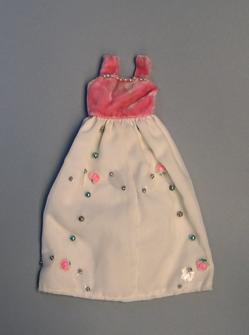 Mouwloos jurkje van roze fluweel met schouderbanden. Aangerimpelde rok van nylon met opgenaaide kraaltjes, bloemen en blaadjes.- Trefwoorden
