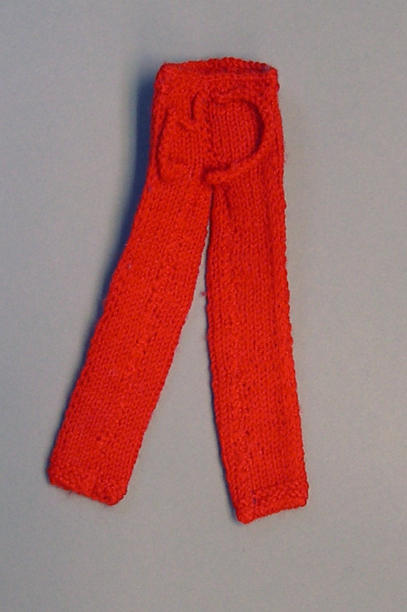 Lange broek, gebreid in tricotsteek met rode wol.- Trefwoorden
