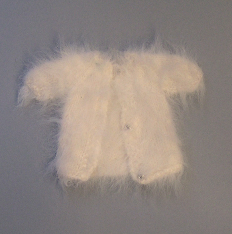 Vestje met lange mouw, gebreid van witte wol.- Trefwoorden