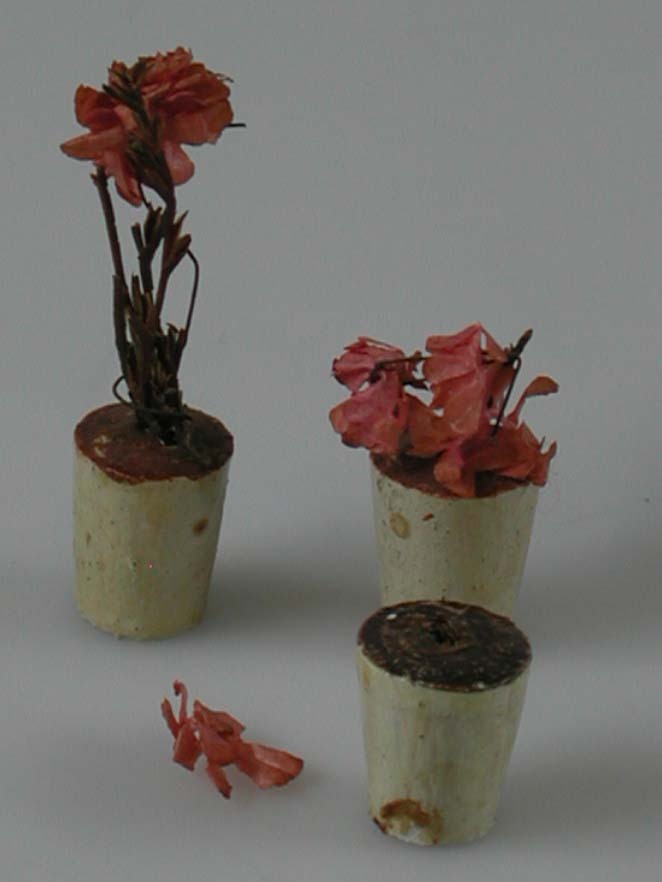 Drie miniatuurbloempotjes, waarvan een nog compleet met bloem.- Trefwoorden