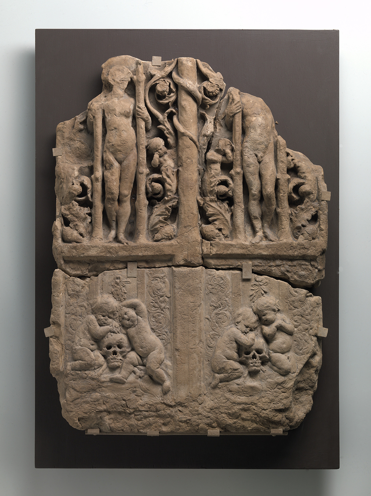 schets voor een - niet uitgevoerde - bronzen afsluiting van het venster tussen de Vierschaar en de Burgemeesterskamer op de eerste verdieping in het 17de-eeuwse stadhuis. In de bewaard gebleven stadhuisrekeningen wordt het model niet vermeld, In de Notitie uit 1769 van Ploos van Amstel wordt 'een Model van de deuren der Vierschaar verbeeldende Adam en Eva' genoemd. ( Bert Vreeken)