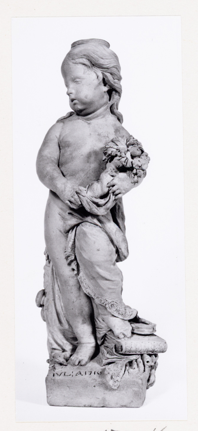 het kind heeft een bloemenkorf in de hand en steunt met de linkervoet op boeken. Op het hoofd een smalle rand, wellicht bedoeld als steun voor een los aan te brengen hoofddeksel. Achter de figuur ligt een kanon. De combinatie van bloemkorf en 'kanon in ruste' kan geïnterpreteerd worden als een verbeelding van de vrede. ( Michiel Jonker)