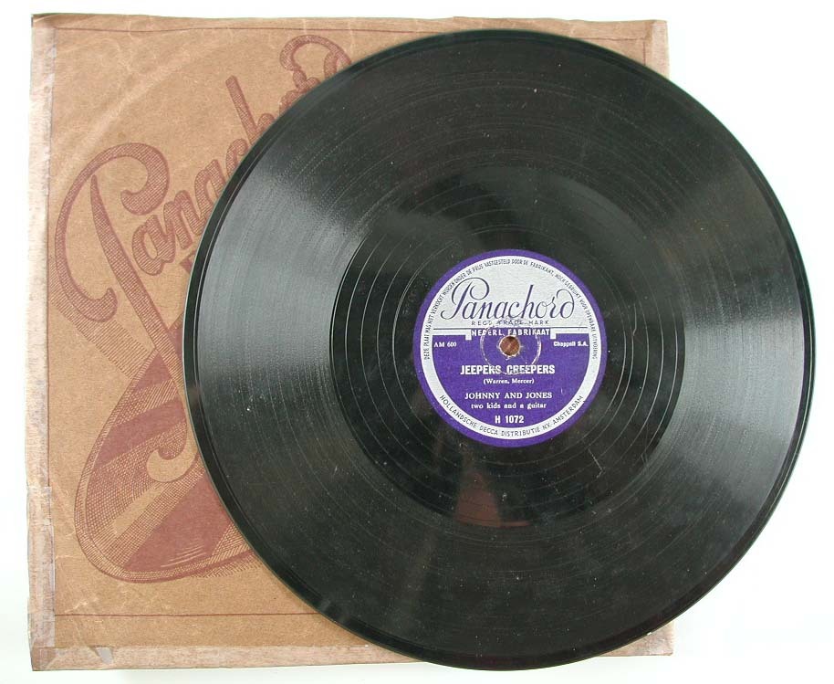 De 78-toerenplaat is de oudste grammofoonplaat. De meeste vroege 78-toerenplaten werden gemaakt van schellak, dat zeer breekbaar was. Gewoonlijk stonden er twee nummers op één plaat, één op de A-kant en één op de B-kant. Zo ook op deze plaat, waar het de nummers 'Jeepers Creepers' en 'Hold Tight' betreffen. De liedjes zijn uitgevoerd door Johnny and Jones, een Amsterdams jazzduo, bestaande uit Nol (Arnold Siméon) van Wesel (1918-1945) en Max (Solomon Meyer) Kannewasser (1916-1945). Ze maakten humoristische parodieën, steevast in een Amerikaans accent uitgesproken. Hun grootste hit was ‘Mijnheer Dinges weet niet wat swing is’ uit 1938. Tijdens de Duitse bezetting mochten de joodse Nol en Max niet meer optreden. In 1943 werden ze samen met hun echtgenotes opgepakt en in kamp Westerbork tewerkgesteld. Ze zouden de oorlog niet overleven. ( Sarah Remmerts de Vries)