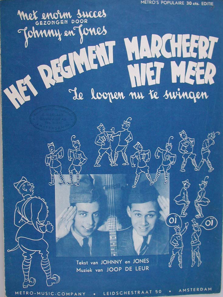 Deze bladmuziek hoort bij het nummer 'Het Regiment marcheert niet meer' van Johnny and Jones. Johnny and Jones was een Amsterdams jazzduo, bestaande uit Nol (Arnold Siméon) van Wesel (1918-1945) en Max (Solomon Meyer) Kannewasser (1916-1945). Ze maakten humoristische parodieën, steevast in een Amerikaans accent uitgesproken. Hun grootste hit was ‘Mijnheer Dinges weet niet wat swing is’ uit 1938. Tijdens de Duitse bezetting mochten de joodse Nol en Max niet meer optreden. In 1943 werden ze samen met hun echtgenotes opgepakt en in kamp Westerbork tewerkgesteld. Ze zouden de oorlog niet overleven. ( Sarah Remmerts de Vries)