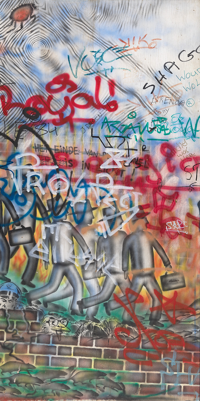 Van 1983 tot 1985 staat op het Waterlooplein een 60 meter lange schutting beschilderd door Hugo Kaagman. Daarachter ligt het bouwterrein waar het nieuwe gebouw van het stadhuis en de opera verrijst. Het is de tijd van het doemdenken, economische crisis, werkloosheid en de angst voor kernwapens. Dat verwerkt Kaagman in zijn beeldverhaal. In die jaren dat de schutting op het Waterlooplein staat voegen veel voorbijgangers er teksten en handtekeningen aan toe. ( Anneke van de Kieft)