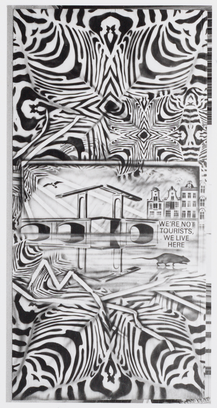 Rondom een bouwput op het Waterlooplein was in 1983 een zestig meter lange schutting geplaatst. Deze werd daarna geheel beschilderd door graffitikunstenaar Hugo Kaagman. Met behulp van sjablonen verwerkte hij politieke en sociale onderwerpen in collages. Amsterdamse motieven worden afgewisseld met Arabische en zebrapatronen. Toen de schutting overbodig was, zijn de panelen met afbeeldingen van het Paleis op de Dam en de Magere Brug aangekocht door het museum. ( Norbert Middelkoop)
