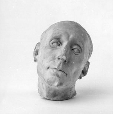 Masker van een oudere man, frontaal, de ogen naar rechts opgeslagen.- Trefwoorden