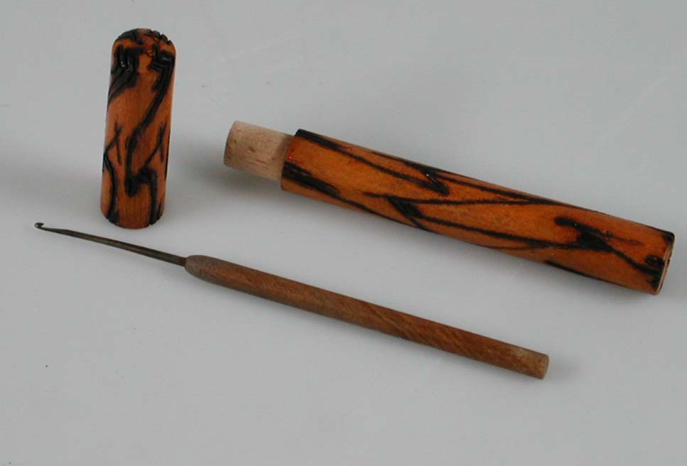 Grotere ronde koker met dop, van hout. In koker zit haaknaald.- Trefwoorden