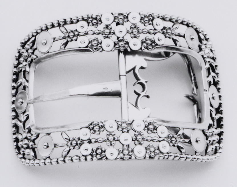 Zilveren schoengespen behoorden omstreeks 1800 tot de modieuze kledingaccessoires, zowel in de stad als op het platteland. Deze exemplaren, bestemd voor herenschoenen, hebben mogelijk deel uitgemaakt van een streekdracht in West-Friesland. De gladde schijfjes in de rand, die enigszins aan stuivertjes doen denken, tonen verwantschap met die van een tasbeugel, in 1830 door Frans Ernst Held vervaardigd (cat.nr. KA 19278). Amsterdamse zilversmeden namen vanouds een groot deel van de productie van modeaccessoires voor de West-Friese markt voor hun rekening. Zie het commentaar bij cat.nr. KA 5507. ( Bert Vreeken)
