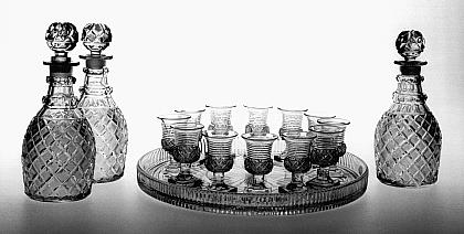 Dienblad, drie karaffen en twaalf likeurglazen.- Trefwoorden