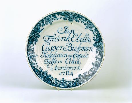 - opschrift voorzijde: Jan/ Frederik Ebell, &/ Casper Biekman,/ Kooplieden in Engels:/ Delfs: en Ceuls/ Aardewerk/ 1784/: reclameopschrift