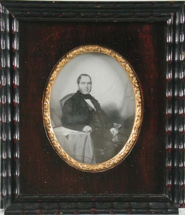 etiket achterzijde lijst: Backer Stichting/ JHR Mr Willem Jacob Backer/1798-1851/trouwt Anna Maria Rendorp./: wit, vierkant etiket met blauwe letters