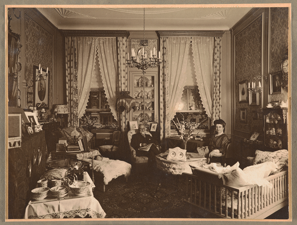Album met zes foto's van het interieur en de tuin. Op een van de foto's zit het echtpaar Cornelia Henrietta Backer en haar echtgenoot Jan Arend Hoeufft.- Trefwoorden