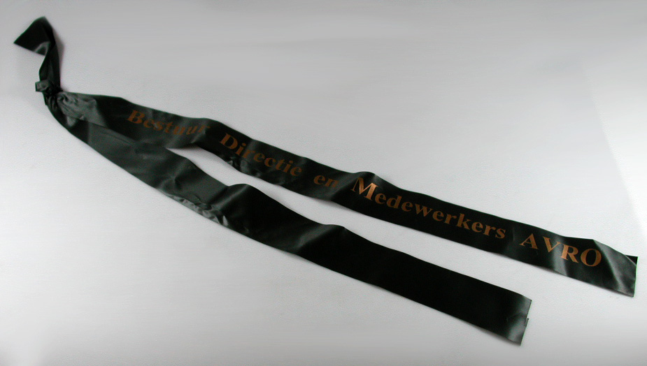 Twee donkergrijze linten met opdruk 'Bestuur Directie en Medewerkers AVRO'- Trefwoorden