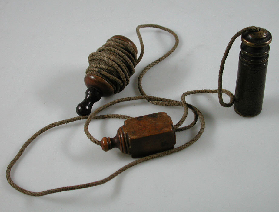 Schietlood, met cylindervormig stuk koper als gewicht. Daarin zijn versierrandjes gedraaid. Aan andere eind zit een houten klosje met klein donkerbruin handvatje, waar touw omheen is gerold. Over touw heen geschoven is rechthoekig blokje hout met ronde knop.- Trefwoorden