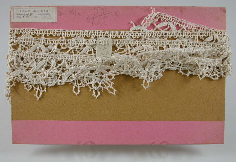 Strook katoenen kant, geschulpt aan onderzijde. Strook is om plaat karton gewikkeld, die is afgezet met hardrose papier.