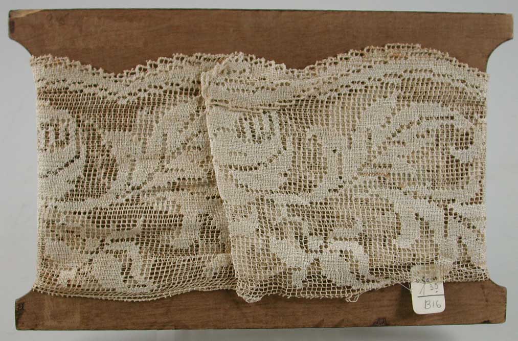 Strook katoenen kant, geschulpt aan onderzijde. Strook is om plaat triplex gewikkeld. Plankje is gestempeld met zwarte inkt: 172. Aan strook hangt kartonnen kaartje, waarop met potlood is geschreven: 130/ -----/ B16/.- Trefwoorden
