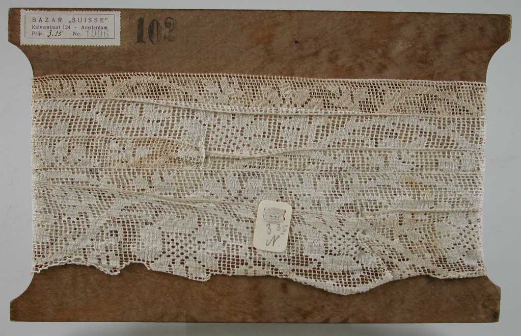 Strook katoenen kant, geschulpt aan onderzijde. Strook is om plaat triplex gewikkeld.