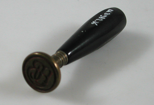 Lakstempel met monogram van letters HJB. Zwart kunststof met koper.- Trefwoorden