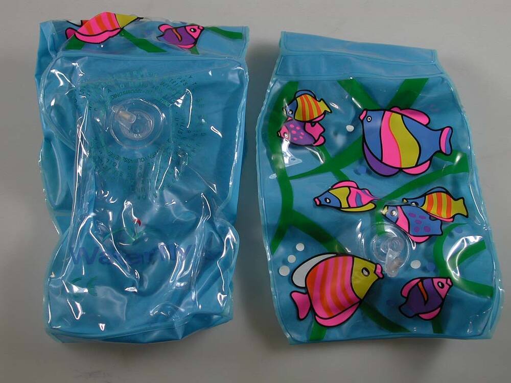 Twee blauwe zwembandjes met vissendecoratie- Trefwoorden