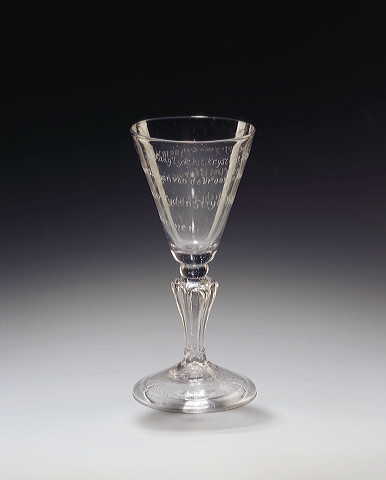 De gegraveerde versiering van dit glas oogt weinig spectaculair maar is toch heel bijzonder. Rond de kelk is spiraalsgewijs het vers 'De Glasblaaser' van de Amsterdamse tekenaar en graveur Jan Luyken (1649-1712) geschreven. 'Behaag'lyk vat, krystalle glas, Doorluchtig, of 't geen Lichaam was (…)', zo luiden de beginregels van het gedicht. De onbekende glasgraveur, wiens naam mogelijk met de letter 'K' op de onderkant van de voet is aangeduid, heeft de regels met een harde diamantstift op het ragfijne glas aangebracht. Dat heeft hij heel precies gedaan, want te oordelen naar het gebruikte lettertype heeft hij waarschijnlijk de eerste druk van Luykens 'Het Menselyk Bedryf' als voorbeeld gebruikt. In 1694 gaf Jan Luyken de publicatie samen met zijn zoon Casper (1672-1708) in eigen beheer uit. Het is een boek over menselijke bezigheden: ambachten en beroepen, waarin ook 'De Glasblaaser' is opgenomen. Behalve een benaming en een motto, voorzag Luyken, die een zeer vroom man was, elke prent van een kort, stichtelijk gedicht. De prenten waren bij verschijnen al populair en zij werden in de eeuwen die volgden vele malen gekopieerd en gereproduceerd. Nog steeds behoren ze tot het bekendste Nederlandse cultuurgoed uit de 17de eeuw. Wie kent niet de afbeelding van de bakker of de boekdrukker op een koffiemok of een plastic tas? De graveur van dit 18de-eeuwse glas is anders te werk gegaan. Hij koos juist niet voor de afbeelding maar voor de tekst, die hier subtiel samenvalt met het broze karakter van het materiaal glas. ( Bert Vreeken)