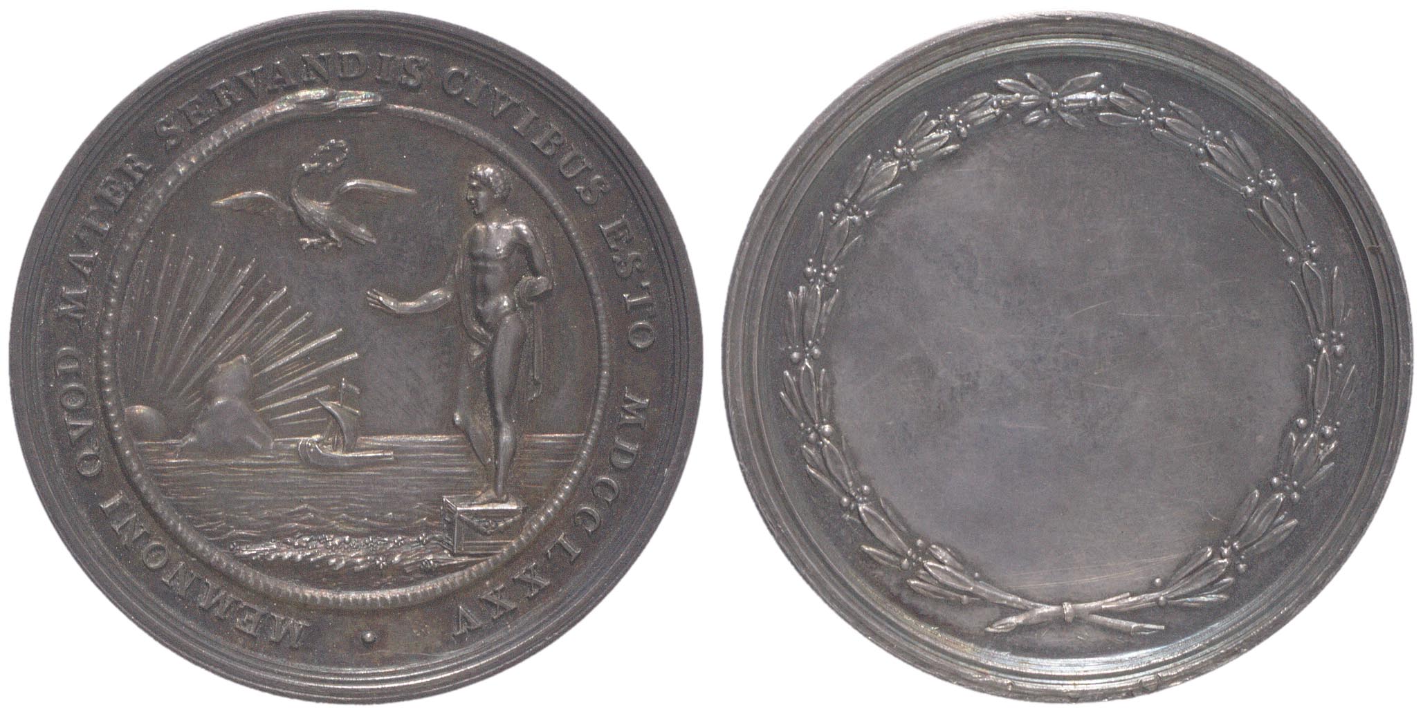 omschrift voorzijde: MEMNONI QVOD MATER SERVANDIS CIVIBVS ESTO MDCCLXXV.