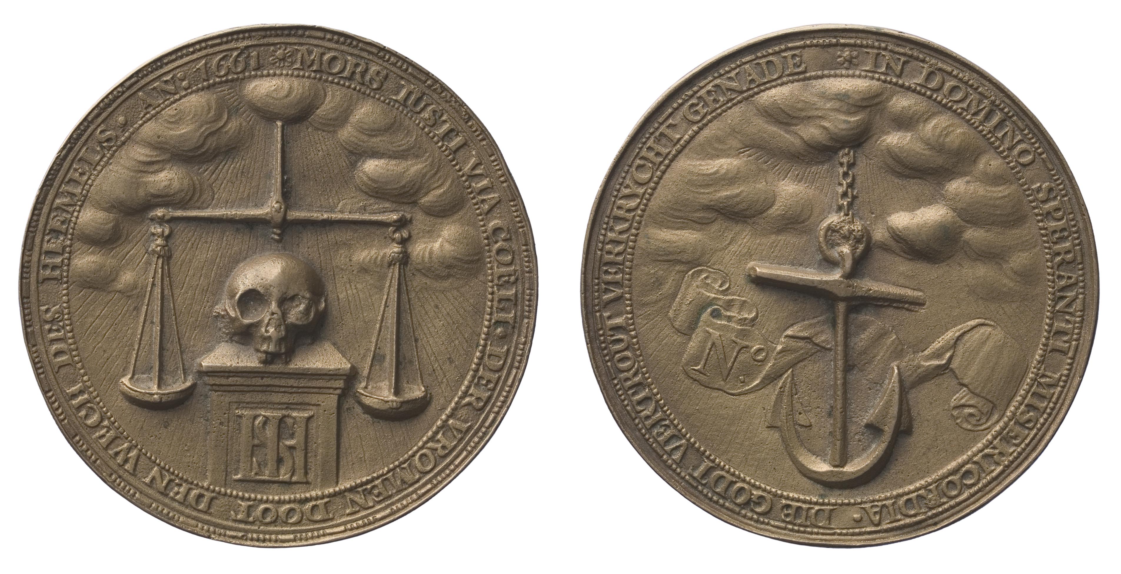 voorzijde: in een omschrift en dubbele parelcirkel onder een wolkenlucht een weegschaal waaronder een schedel op een altaar met monogram.