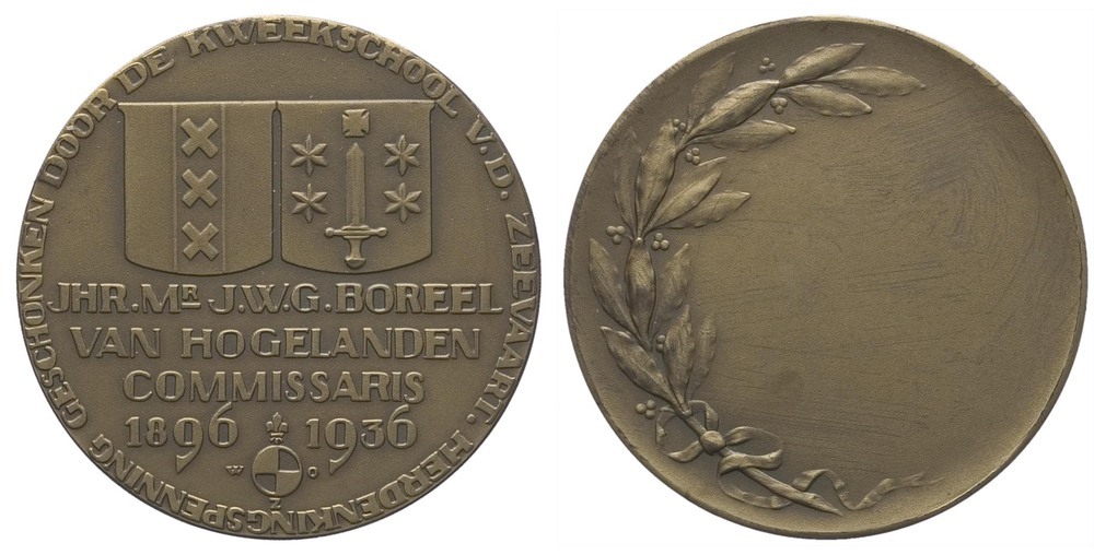 opschrift voorzijde: JHR.MR.J.W.G.BOREEL / VAN HOGELANDEN / COMMISSARIS / 1896 1936