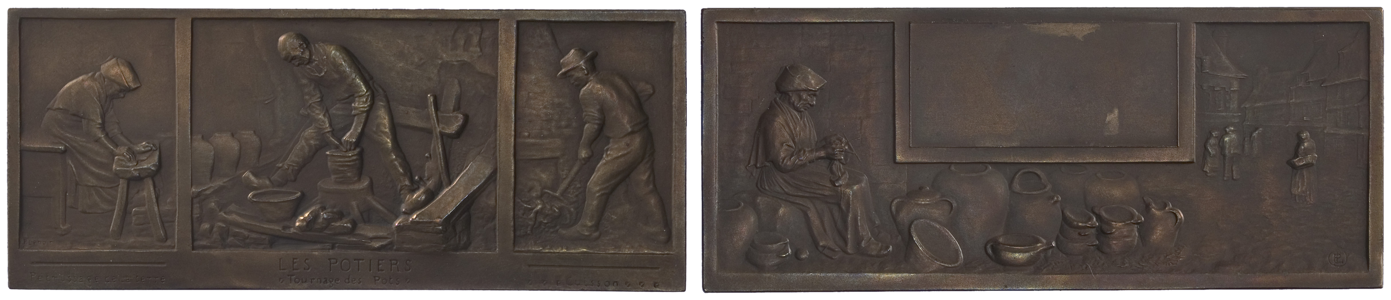 voorzijde: langwerpige rechthoekige liggende penning in de vorm van een drieluik waarop drie figuren bezig met het pottenbakkersambacht. Links kneed een vrouw de klei; in het midden draait een man een pot; rechts stookt een man een vuur om de potten te bakken.